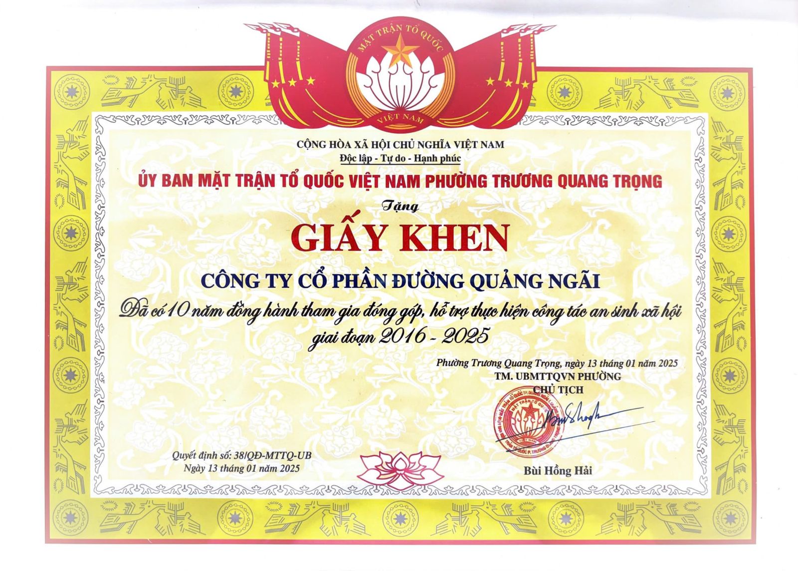 Được biết, ngày 13/01/2025, Công ty Cổ phần Đường Quảng Ngãi vinh dự nhận Giấy khen đã có 10 năm đồng hành tham gia đóng góp, hỗ trợ thực hiện công tác an sinh xã hội giai đoạn 2016-2025 tại Quyết định số 38/QĐ-UBMTTQ-UB của Ủy ban MTTQ Việt Nam tỉnh Quảng Ngãi.