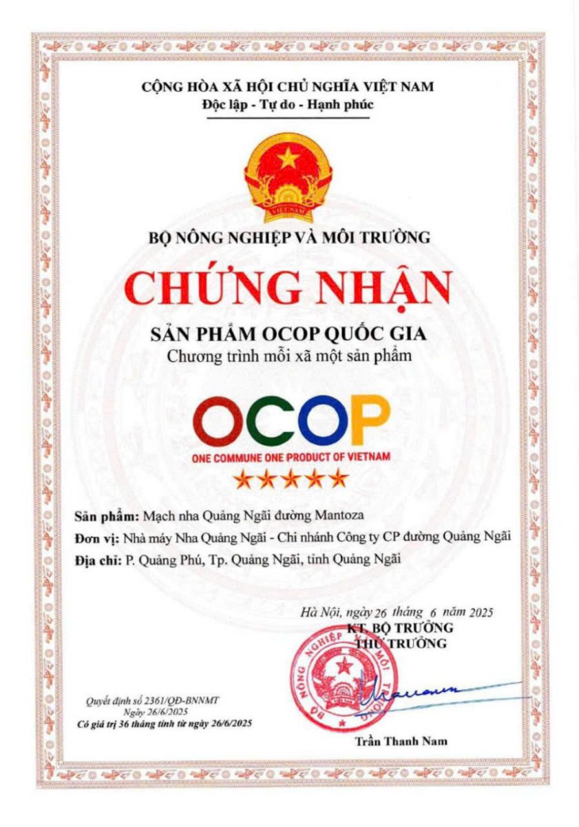 Ngày 24/6/2025, sản phẩm Mạch Nha Quảng Ngãi – Đường Mantoza của Nhà máy Nha, Chi nhánh Công ty Cổ phần Đường Quảng Ngãi, đã chính thức được công nhận đạt chứng nhận OCOP 5 sao cấp Trung ương.